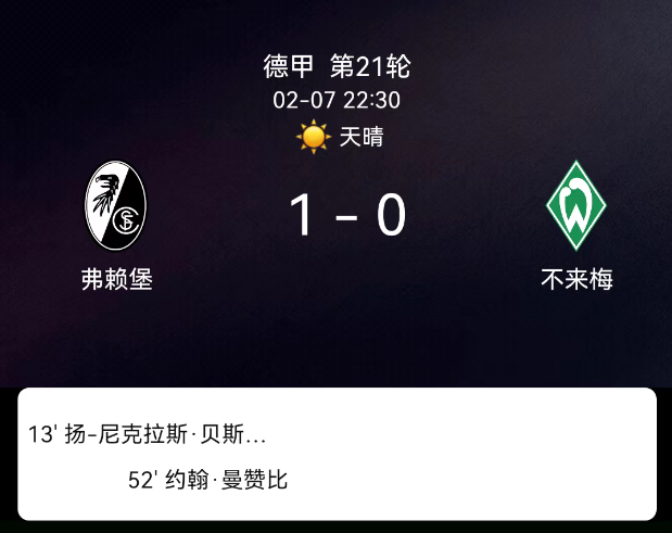北京时间2月7日德甲第21轮,弗赖堡对阵云达不莱梅。第13分钟贝斯特破门1-0;第52分钟曼赞比红牌;无其他红黄牌及进球。最终比分,弗赖堡1-0云达不莱梅。