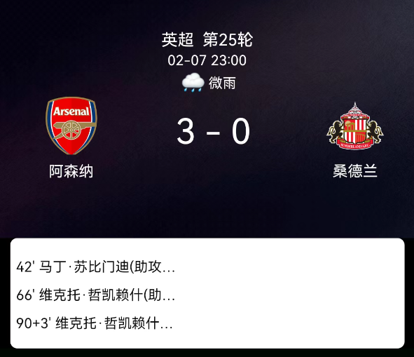 北京时间2月7日英超第25轮,阿森纳对阵桑德兰。第42分钟苏比门迪破门1-0;第66分钟哲凯赖什破门2-0;第90+4分钟哲凯赖什破门3-0;双方无红黄牌。最终比分,阿森纳3-0桑德兰。