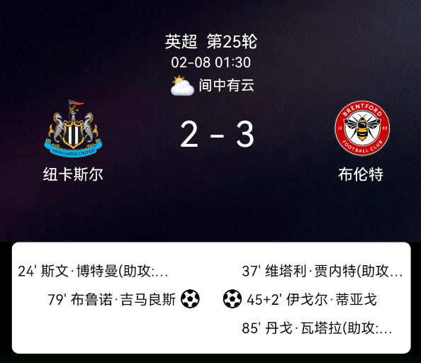 北京时间2月8日英超第25轮,纽卡斯尔联对阵布伦特福德。第23分钟博特曼破门1-0;第36分钟雅内尔特破门1-1;第45分钟蒂亚戈点射1-2;第78分钟吉马良斯点射2-2;第86分钟瓦塔拉破门2-3;双方无红黄牌。最终比分,纽卡斯尔联2-3布伦特福德。
