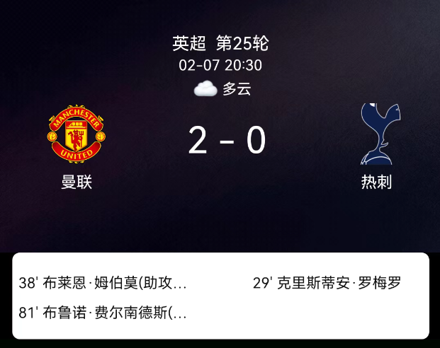 北京时间2月7日英超第25轮,曼联对阵热刺。第29分钟罗梅罗直红;第37分钟阿马德黄牌;第37分钟姆伯莫破门1-0;第80分钟B费破门2-0;双方无其他红黄牌。最终比分,曼联2-0托特纳姆热刺。