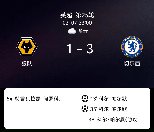 北京时间2月7日英超第25轮,狼队对阵切尔西。第13分钟帕尔默点射0-1;第35分钟帕尔默点射0-2;第38分钟帕尔默破门0-3;第54分钟阿罗科达雷破门1-3;第74分钟库库雷利亚黄牌;无其他红黄牌。最终比分,狼队1-3切尔西。