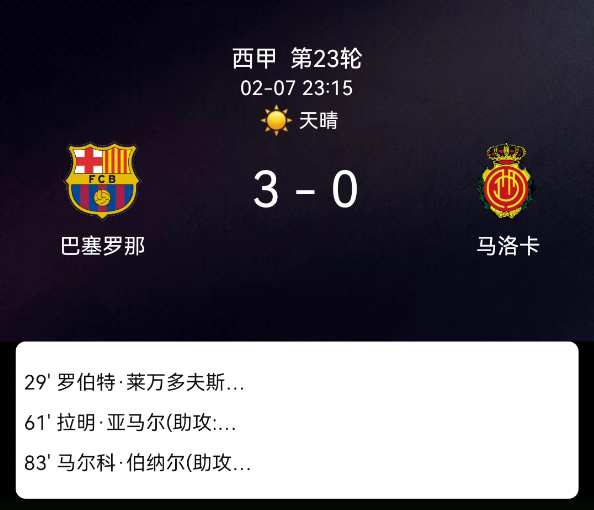 北京时间2月7日西甲第23轮,巴塞罗那对阵马略卡。第29分钟莱万破门1-0;第61分钟亚马尔破门2-0;第83分钟贝尔纳尔破门3-0;双方无红黄牌。最终比分,巴塞罗那3-0马略卡。