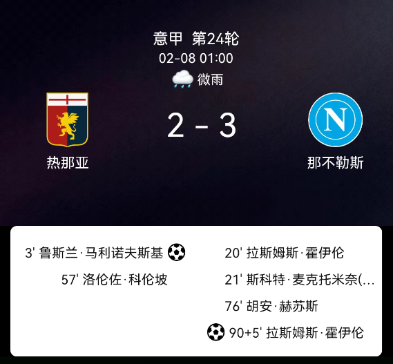北京时间2月8日意甲第24轮,热那亚对阵那不勒斯。第2分钟马利诺夫斯基点射1-0;第20分钟霍伊伦破门1-1;第22分钟麦克托米奈破门1-2;第57分钟科隆博破门2-2;第77分钟胡安-热苏斯红牌;第90+5分钟霍伊伦点射2-3;无其他红黄牌。最终比分,热那亚2-3那不勒斯。