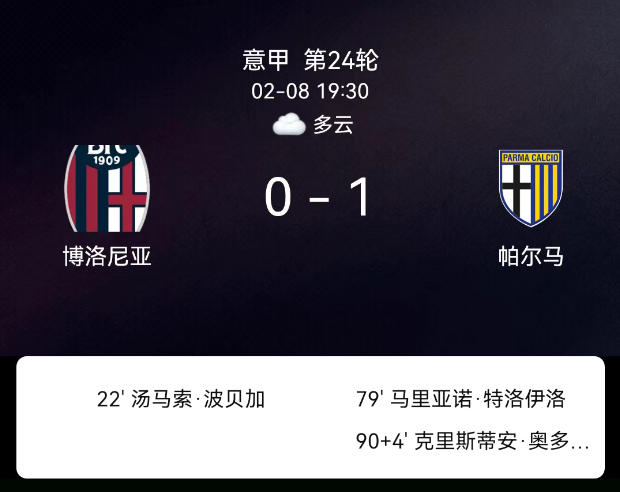 北京时间2月8日意甲第24轮,博洛尼亚对阵帕尔马。第22分钟波贝加红牌;第79分钟特罗伊洛红牌;补时4分钟奥多涅斯破门0-1;无其他红黄牌及进球。最终比分,博洛尼亚0-1帕尔马。