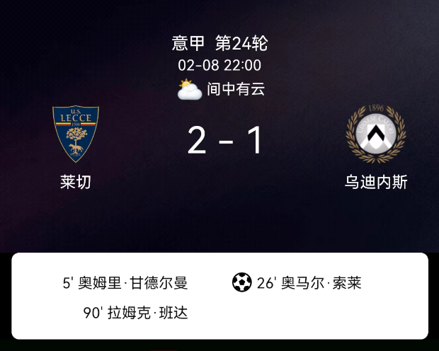 北京时间2月8日意甲第24轮,莱切对阵乌迪内斯。第5分钟甘德尔曼破门1-0;第26分钟索莱-博马沃科点射1-1;第90分钟班达破门2-1;双方无红黄牌。最终比分,莱切2-1乌迪内斯。