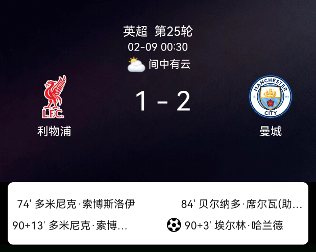 北京时间2月9日英超第25轮,利物浦对阵曼城。第74分钟索博斯洛伊破门1-0;第84分钟B席破门1-1;第90+3分钟哈兰德点射1-2;第90+13分钟索博斯洛伊红牌;无其他红黄牌。最终比分,利物浦1-2曼城。