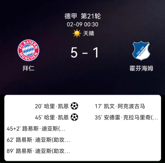 北京时间2月9日德甲第21轮,拜仁慕尼黑对阵霍芬海姆。第20分钟阿克波古马红牌+凯恩点射1-0;第35分钟克拉马里奇破门1-1;第45分钟凯恩点射2-1;第45+2分钟迪亚斯破门3-1;第62分钟迪亚斯破门4-1;第89分钟迪亚斯破门5-1;无其他红黄牌。最终比分,拜仁慕尼黑5-1霍芬海姆。