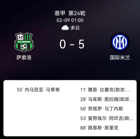北京时间2月9日意甲第24轮,萨索洛对阵国际米兰。第10分钟比塞克破门0-1;第27分钟小图拉姆破门0-2;第50分钟劳塔罗破门0-3;第53分钟阿坎吉破门0-4;第55分钟马蒂奇红牌;第88分钟路易斯-恩里克破门0-5。最终比分,萨索洛0-5国际米兰。
