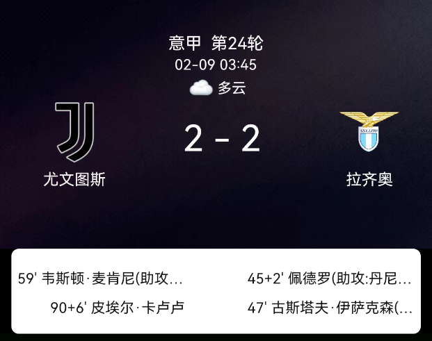 北京时间2月9日意甲第24轮,尤文图斯对阵拉齐奥。第45+2分钟佩德罗破门0-1;第47分钟伊萨克森破门0-2;第59分钟麦肯尼破门1-2;第90+6分钟卡卢卢破门2-2;双方无红黄牌。最终比分,尤文图斯2-2拉齐奥。