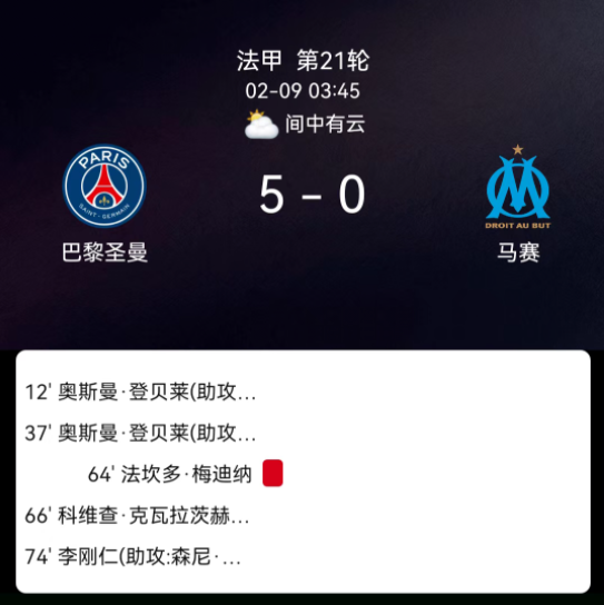 北京时间2月9日法甲第21轮,巴黎圣日耳曼对阵马赛。第12分钟登贝莱破门1-0;第37分钟登贝莱破门2-0;第64分钟梅迪纳乌龙3-0;第66分钟克瓦拉茨赫利亚破门4-0;第74分钟李刚仁破门5-0;双方无红黄牌。最终比分,巴黎圣日耳曼5-0马赛。