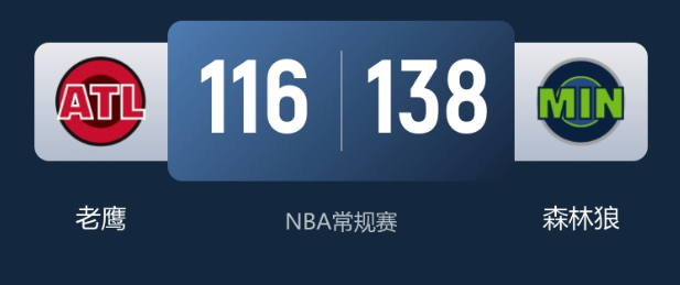 2月10日NBA常规赛森林狼主场迎战老鹰,森林狼次节轰出进攻高潮建立大比分优势,最终138-116击败老鹰,森林狼战绩更新为33-22,老鹰跌至26-29。