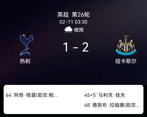 北京时间2月11日英超第26轮,热刺对阵纽卡斯尔联。第45+5分钟佳夫破门0-1;第65分钟阿奇-格雷破门1-1;第68分钟拉姆齐破门1-2;无红牌。最终比分,托特纳姆热刺1-2纽卡斯尔联。