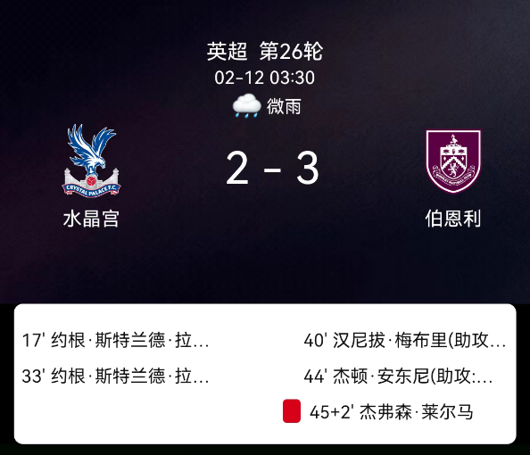 北京时间2月12日英超第26轮,水晶宫对阵伯恩利。第17分钟拉森破门1-0;第33分钟拉森破门2-0;第40分钟梅布里破门1-2;第44分钟安东尼破门2-2;第45+2分钟莱尔马乌龙3-2;双方无红黄牌。最终比分,水晶宫2-3伯恩利。