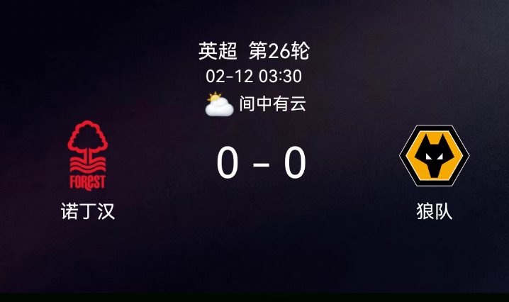 北京时间2月12日英超第26轮,诺丁汉森林对阵狼队。全场无有效进球,卢卡进球因越位被吹;双方无红黄牌。最终比分,诺丁汉森林0-0狼队。
