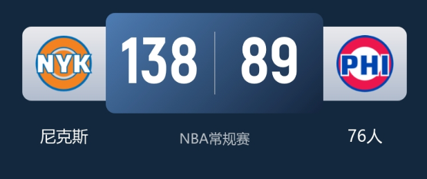 2月12日NBA常规赛尼克斯客场挑战76人,尼克斯开局强势一路领先,最终138-89大胜对手,尼克斯战绩35-20,76人30-24。