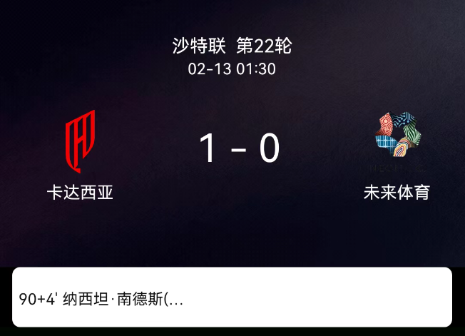 北京时间2月13日沙特联第22轮,卡达西亚对阵新未来城体育。补时第4分钟南德斯破门1-0;双方无红黄牌。最终比分,卡达西亚1-0新未来城体育。
