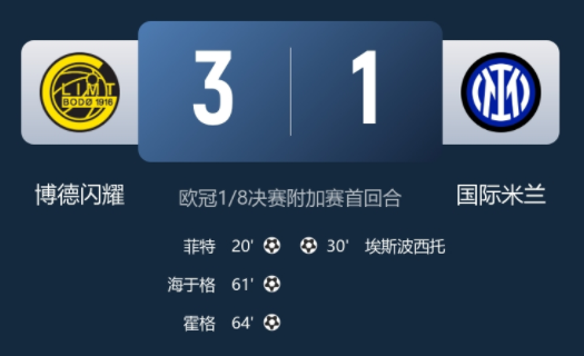 2月19日消息 欧冠1/8决赛附加赛首回合,博德闪耀在阿斯普米拉球场迎战国际米兰。上半场,霍格助攻菲特打破僵局,埃斯波西托抽射扳平;下半场,海于格爆射破门,霍格锁定胜局。最终国际米兰在客场以1-3不敌博德闪耀,两队将于北京时间2月25日移师梅阿查球场再战次回合。